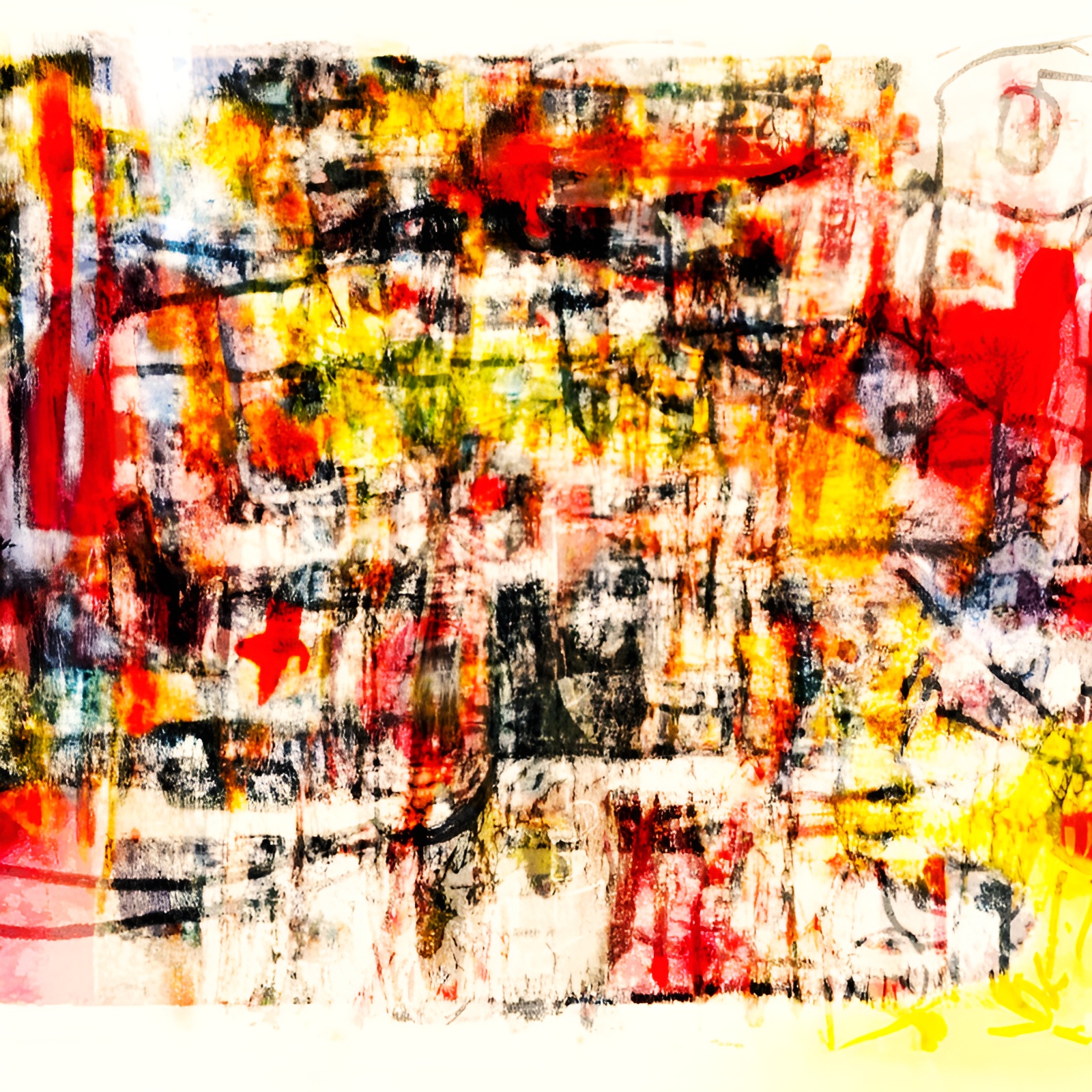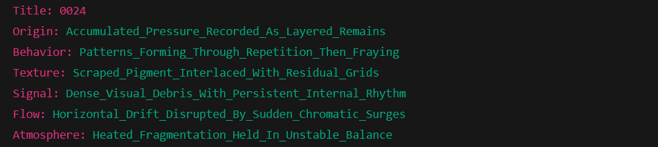 This image behaves like a surface under sustained pressure—colors grinding against one another, leaving behind traces rather than statements. Order appears only briefly, then dissolves into a field of accumulated marks, as if the image remembers many versions of itself at once and refuses to choose a final one.