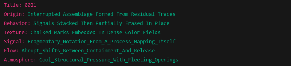 This image feels like a diagram left behind by a passing moment of awareness—marks, blocks, and interruptions layered as if perception paused mid-translation. The darker fields hold tension like retained memory, while the lighter zones behave as spillover, where meaning thins and quietly escapes its own structure.